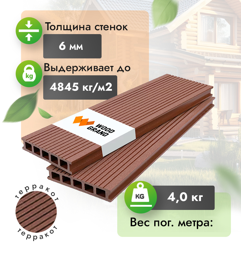Наша террасная доска из ДПК выдерживает до 3318 кг/м2, влагостойкая, не требует ухода.